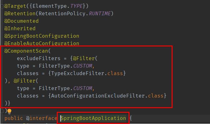 기본적으로 메인 함수에 붙어있는 @SpringBootApplication 어노테이션이 있는데, 해당 어노테이션의 내부를 확인해보면 @ComponentScan 어노테이션이 있음을 확인할 수 있다.